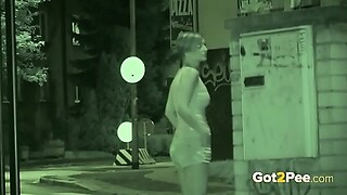 2 min Public Pissing - Night vision catches a hot European peeing outside 222k views EuropeanPublicPussyTeen